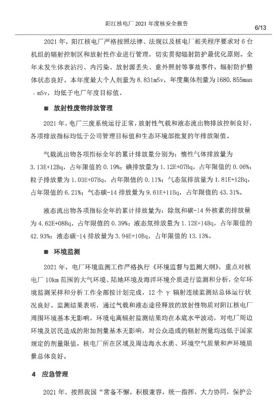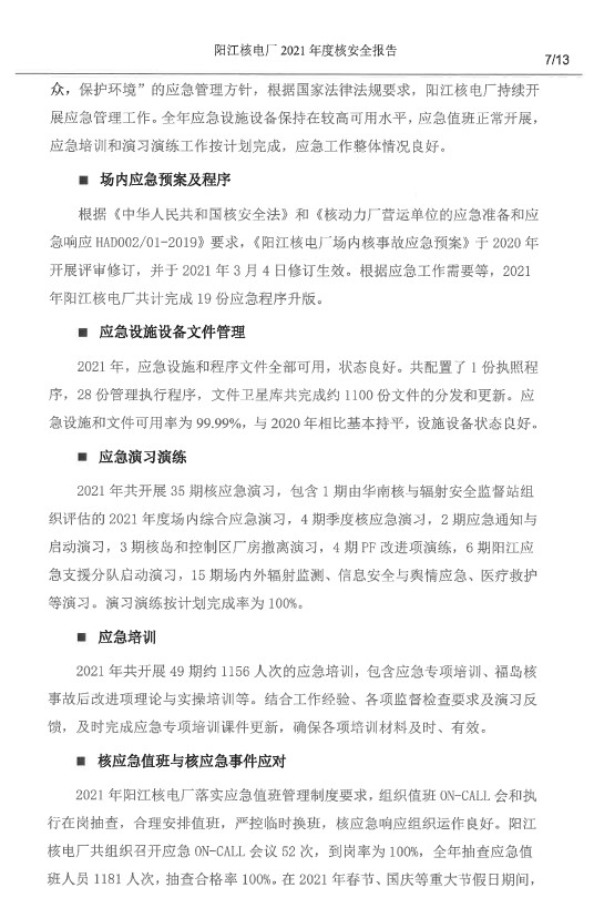 陽江核電廠2021年度核安全報(bào)告